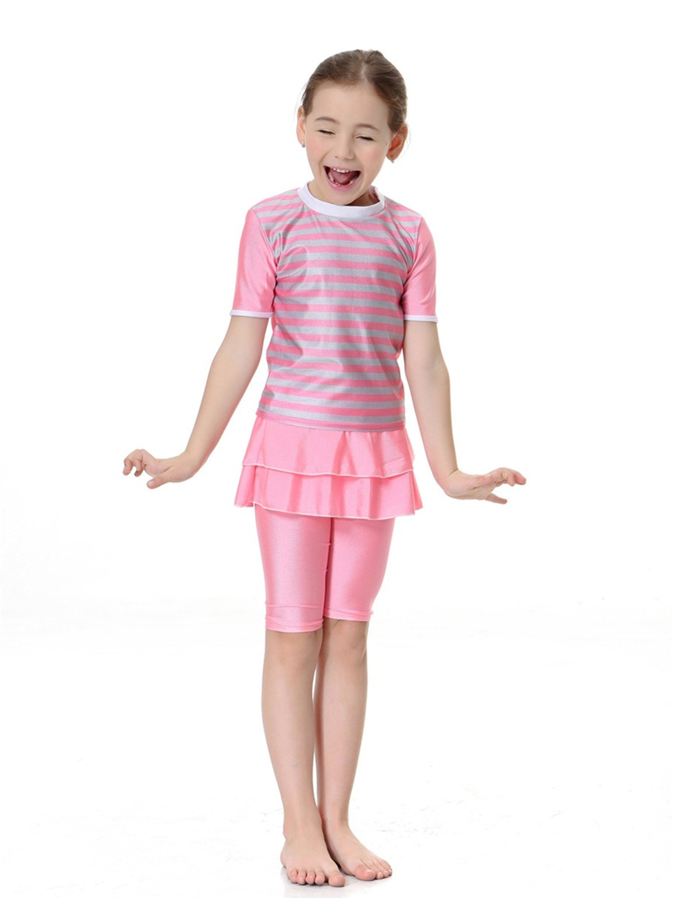 Girls swimsuit conservative split striped round neck short sleeve two-piece swimsuit